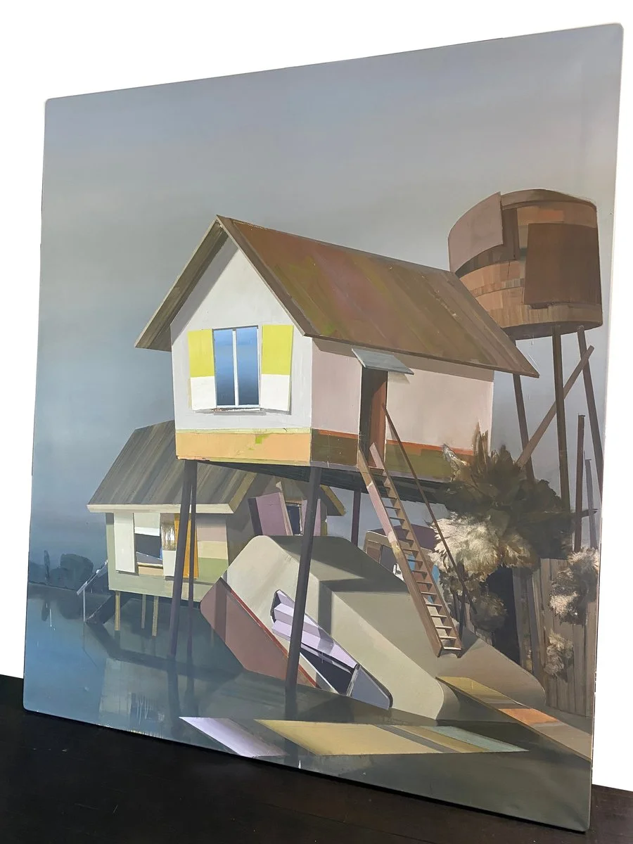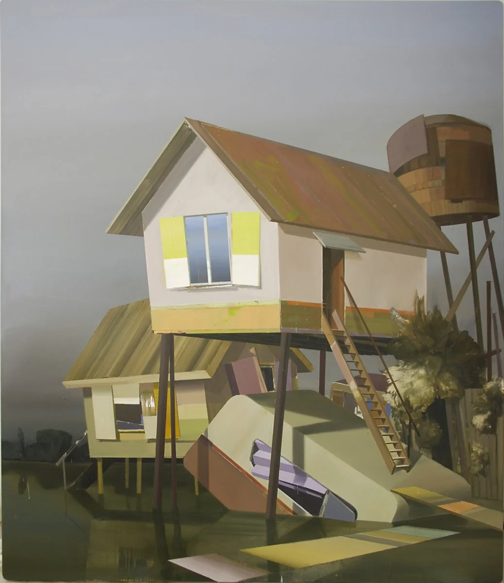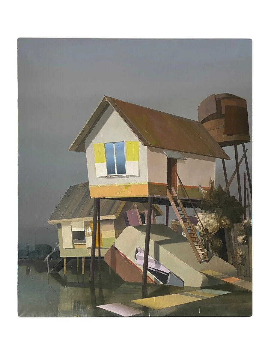 Baufreiheit (2011) is a large-scale architectural landscape by German painter Ulf Puder, a prominent figure associated with the New Leipzig School. Painted in oil on canvas and measuring 220 × 190 cm, the work exemplifies Puder’s distinctive visual language of speculative architecture and suspended structures set within enigmatic, atmospheric landscapes. Often devoid of human presence, these compositions evoke a quiet tension between construction and abandonment, where elements of modernist architecture intersect with a dreamlike spatial logic.